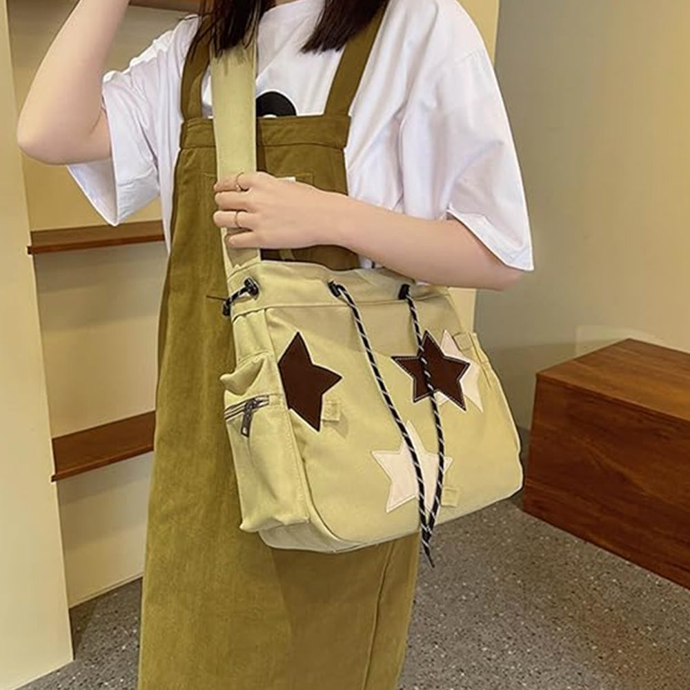 Y2K Canvas Messenger Bag Star Tote Bags Shoulder Travel Crossbody Bags for Women Khaki